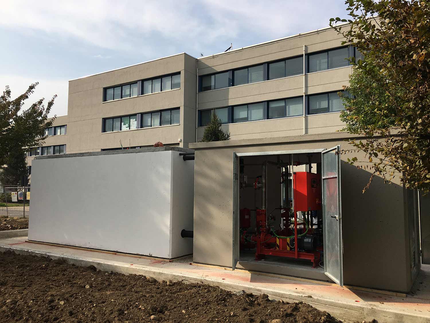 The storage tank, the Service Compartment-Technical Room, and the pumping unit that make up the fire-fighting system must be compliant and sized according to the provisions of the standards based on the type of supply and the parameters to be met (supply duration, flow rate, and pump head).