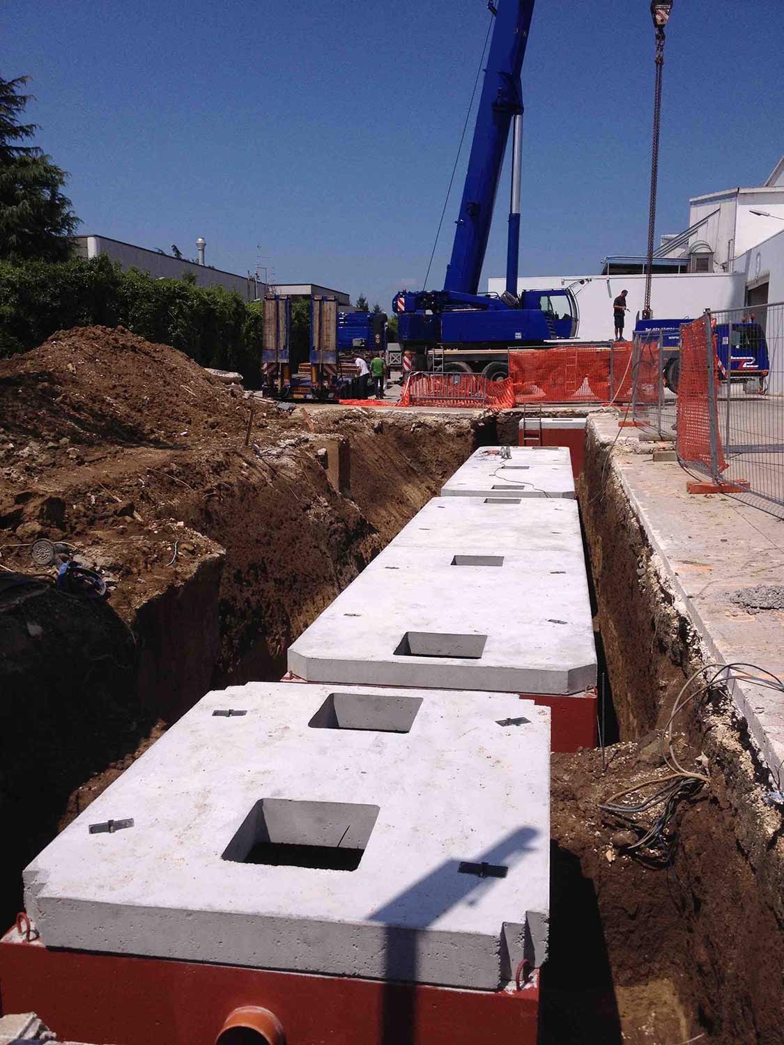 Supply and installation of first rain continuous Sand-Oil Separator with by-pass for the treatment of water from sites with only transit of trucks, produced in DECLARED SERIES, code DD-_____-_S, surface sqm. _____ , total volume before rain mc. __ , diameterDN___ , capacity __ lt./sec., composed of Prefabricated Tanks produced by EDIL IMPIANTI 2 S.r.l. with management system UNI EN ISO 9001 and ISO 45001, made of Solid Concrete Reinforced Vibrato, reinforced with vertical pillars and horizontal struts in stainless steel, with elastomeric protective anti-cracking Elastocolor paint of the external walls in permanent high elasticity and high chemical resistance concrete, concrete in the class of compressive strength C45/55 (RCK >55 N/mm 2), steel internal reinforcement with improved adhesion controlled in the factory and welded mesh type B450C, accompanied by certificates CHEMICAL RESISTANCE and FIRE REACTION (class: A1) issued by external body according to UNI EN standards.