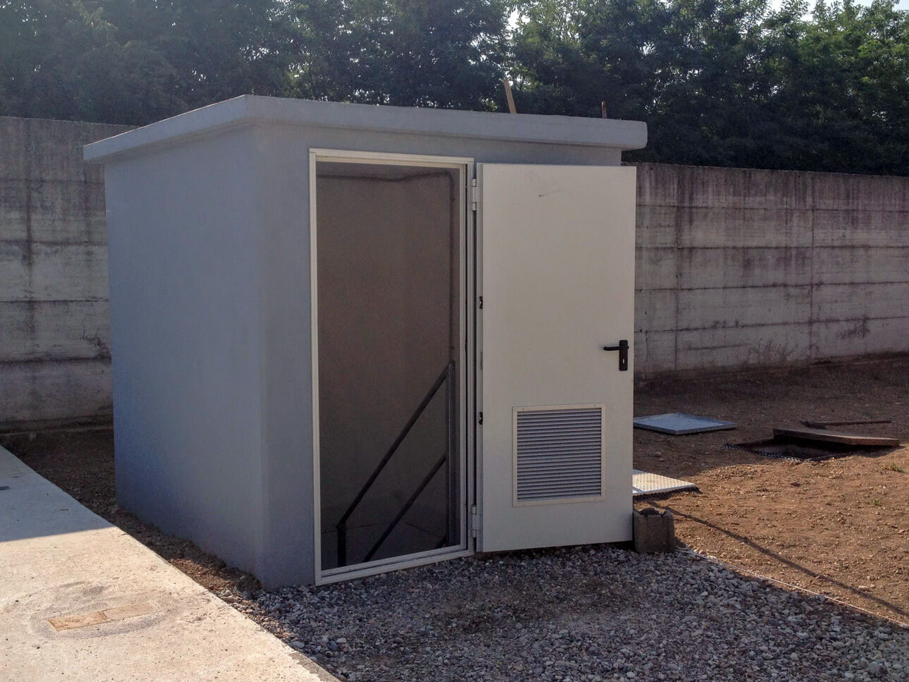 Supply and installation of Prefabricated Cabin/Service Compartment/Above-ground Technical Room produced in DECLARED SERIES, code CAB__-A with type A roofing slab, 10/15 cm thick, sloping and sealed to the structure, or code CAB__-B with type B roofing slab, 10 cm thick, flat and sealed to the structure, external dimensions cm ____x____xh____, produced under UNI EN ISO 9001 and ISO 45001 management systems, made of monobloc R.C.V. with CE certified materials and recycled content according to the requirements indicated in the Minimum Environmental Criteria (CAM), concrete compressive strength class C45/55 (RCK >55 N/mm²), complying with the provisions of UNI EN 206-1 and UNI 11104 for exposure classes XC4, XS3-XD3, XF1, XA2, internal high-bond steel reinforcement, GREESMIX5® steel fibers (if required), IDROCONCRETE 1200® crystallizing additive for integral system waterproof concrete (if required), accompanied by Chemical Resistance and Reaction to Fire certifications issued by an external body according to UNI EN standards, reinforced with vertical R.C.V. pillars and stainless steel horizontal struts where required, with Elastocolor protective anti-crack elastomeric painting of the external concrete walls with permanent high elasticity and high chemical resistance.