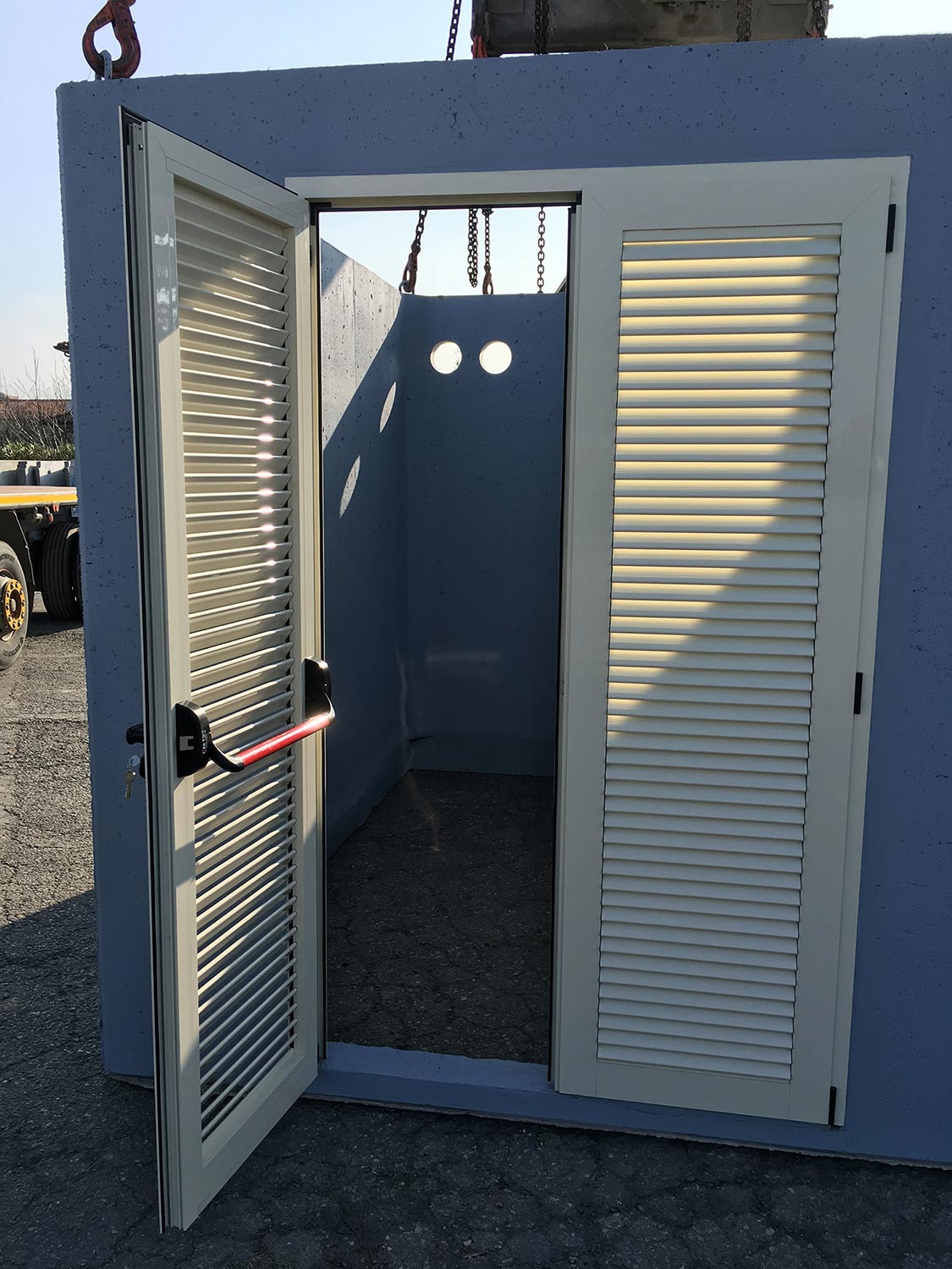 All cellars and rooms can be equipped with REI 60 and REI 120 fire doors (for rooms used as thermal power stations and/or system cabins), internal walls and partitions in reinforced concrete, plasterboard, or glass blocks, flooring and skirting boards, standard internal doors or "Scrigno" type sliding doors—all installed by specialized personnel at the Edil Impianti facility before delivery to the customer.