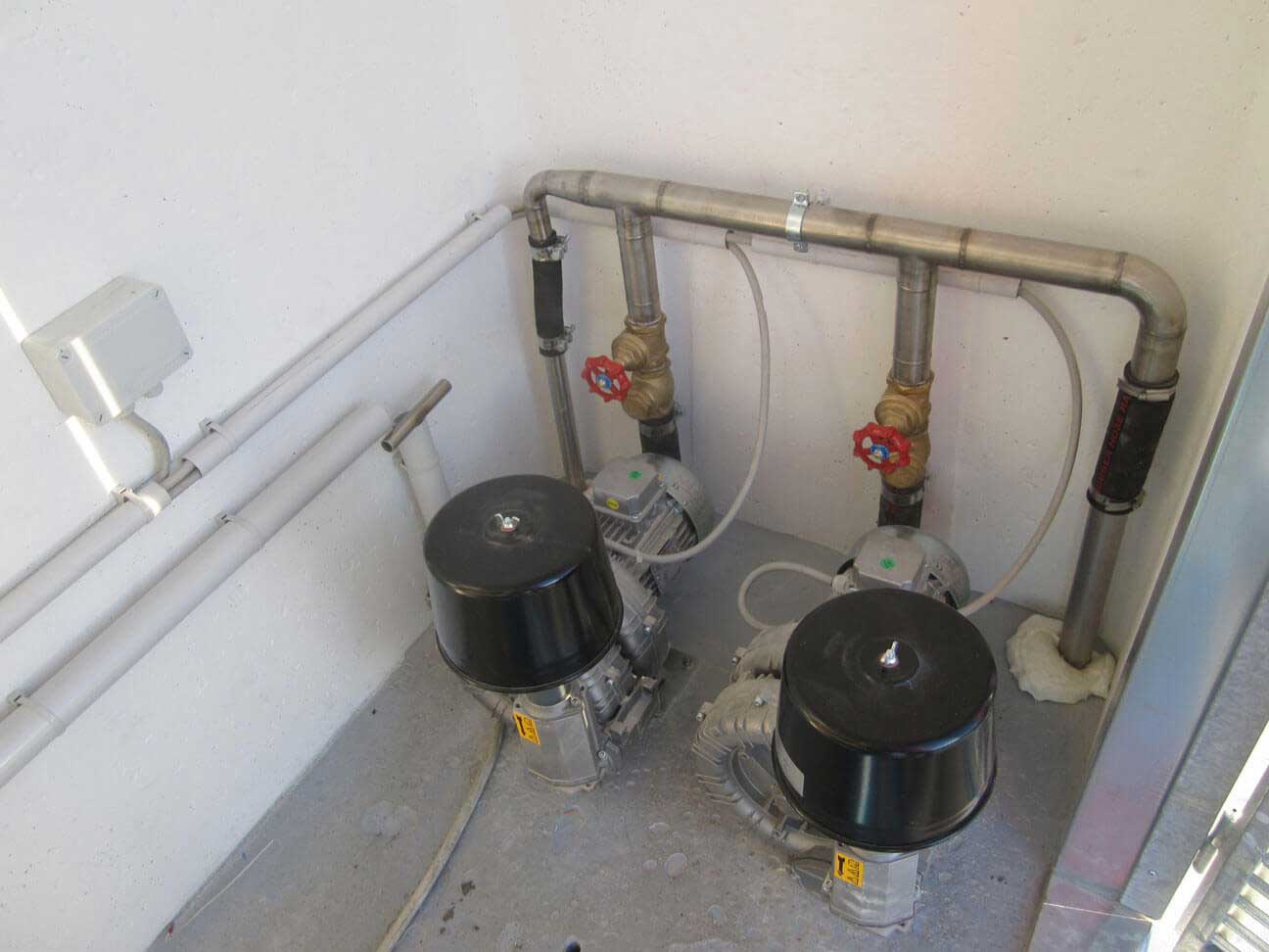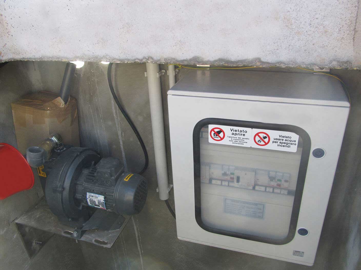 - Vano Tecnico realizzato con manufatto in c.a.v. completo di porta anteriore realizzata in acciaio inox AISI 304 con serratura standard completa di griglie al fine di garantire una aerazione interna minima indispensabile per il corretto funzionamento della soffiante, n.1 quadro elettrico con logica plc programmabile per il controllo delle varie utenze.
