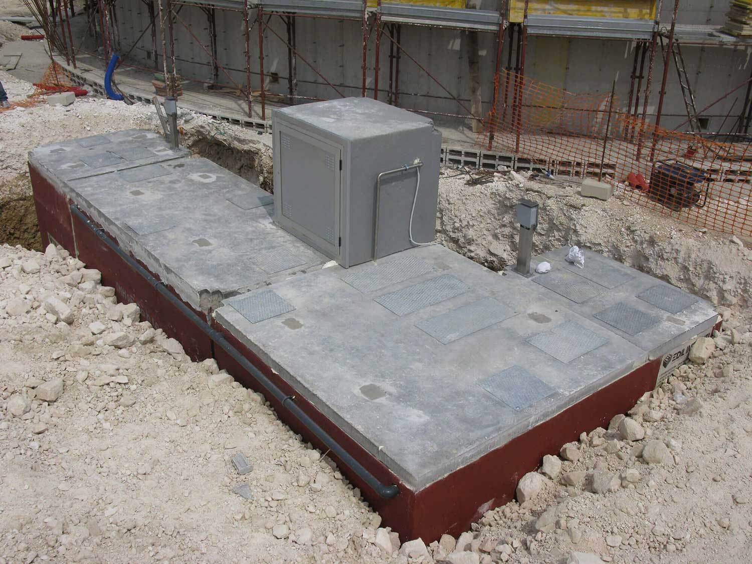 - Vano Tecnico realizzato con manufatto in c.a.v. completo di porta anteriore ad 1 Anta tipo EI2 60 conforme alla UNI EN 1634-1 da cm.90x205, con verniciatura colore RAL9002, con serratura standard completa di griglie al fine di garantire una aerazione interna minima e n.1 quadro elettrico con logica plc programmabile per il controllo delle varie utenze.