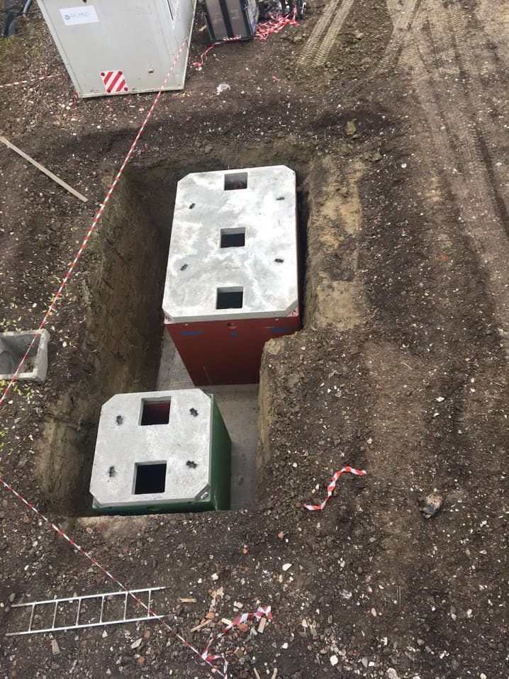 Fornitura e posa in opera di Vasca Settica Bicamerale/Tricamerale da Interrare prodotta in SERIE DICHIARATA codice VSB____ (Bicamerale) oppure VSB-MK__ (Bicamerale versione Miniblock) oppure VST____ (Tricamerale), conforme alla norma UNI EN 12566-1, delle dimensioni esterne di cm.___x___xh.___ , volume utile ______ lt, da N.___ A.E. con litri ___ , prodotta con sistema di gestione UNI EN ISO 9001 e ISO 45001, realizzata in C.A.V. monoblocco con materiali certificati CE e contenuto di riciclato secondo i requisiti indicati nei Criteri Ambientali Minimi (CAM), calcestruzzo in classe di resistenza a compressione C45/55 (RCK >55 N/mm²), conforme alle prescrizioni previste nella norma UNI EN 206-1 e UNI 11104 per le classi di esposizione XC4, XS3-XD3, XF1, XA2, armature interne in acciaio ad aderenza migliorata, fibre d’acciaio GREESMIX5® (se previsto), additivo cristallizzante per calcestruzzi impermeabili a sistema integrale IDROCONCRETE 1200® (se previsto), corredata di attestazioni Resistenza Chimica e Reazione al Fuoco rilasciate da organo esterno secondo le norme UNI EN, rinforzata con pilastri verticali in c.a.v. e puntoni orizzontali in acciaio inox ove previsto, con pittura elastomerica protettiva antifessurazione Elastocolor delle pareti esterne in calcestruzzo ad alta elasticità permanente ed elevata resistenza chimica.