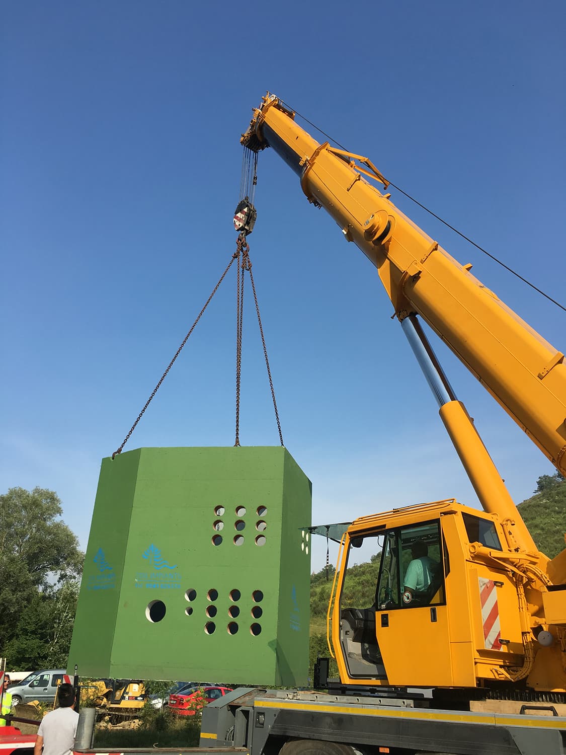 La progettazione è stata eseguita per effettuare il montaggio su nuove condotte o collettori fognari esistenti, il peso è stato calcolato in modo da consentire la posa in opera con mezzi meccanici di piccole dimensioni. La predisposizione dei moduli (base+prolunga+lastra di copertura) con impronte indebolite o fori carotati sulle pareti verticali permette il montaggio con tubazioni provenienti da tutte le direzioni e da quote diverse. La struttura fibrorinforzata realizzata con fibre d'acciaio GREESMIX5® (Brevetto N.0001421398 rilasciato dal Ministero dello Sviluppo Economico) è idonea a grandi profondità e a interramenti eccezionali, è inoltre completo di lastra di copertura carrabile per mezzi pesanti (prima 1a categoria stradale) dotata di fori ispezionabili (passo d'uomo) standard cm.60 o su misura.