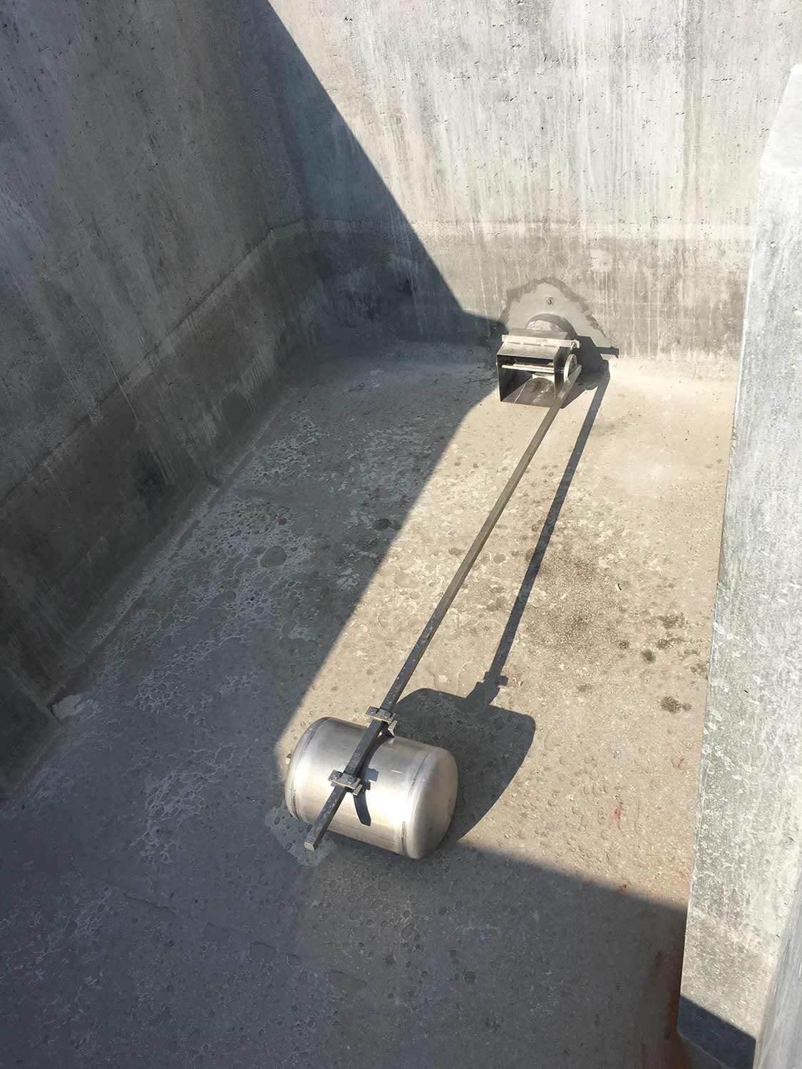 La lama che regola il flusso e la bocca tarata è montata su di una scatola collegata alla tubazione di uscita e viene aperta o chiusa in funzione della posizione di un asta e di un galleggiante alla quale è collegata. Non sono necessarie regolazioni in quanto il sistema viene già installato nella vasca presso stabilimento e tarato in funzione della tubazione di entrata / uscita.