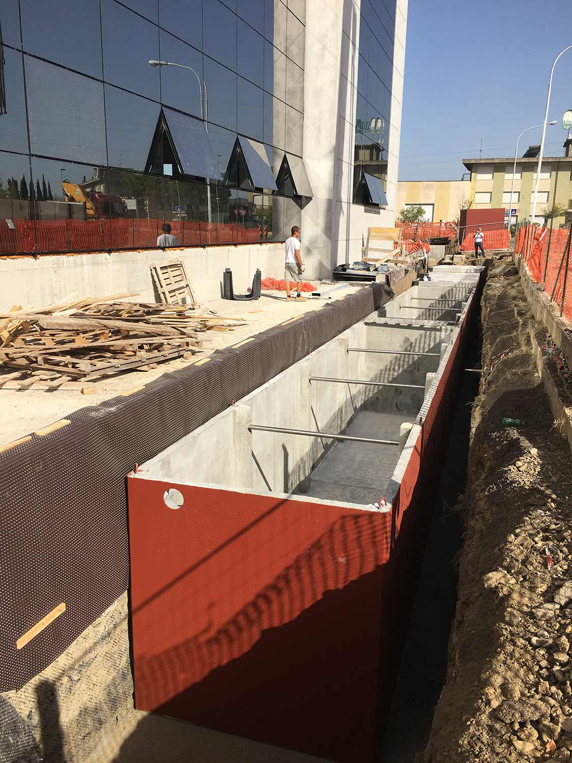 Fornitura e posa in opera di Vasca di Laminazione / Invarianza Idraulica da Interrare con uscita a diametro ridotto, prodotta in SERIE DICHIARATA, codice VACM______ oppure con pareti dello spessore nominale a scelta di cm.10/15/20 codice VACM______ _S10/S15/S20, delle dimensioni esterne di cm.___x___xh___ da mc.____ con pareti dello spessore di cm.__ e fondo dello spessore di cm.__, prodotta con sistema di gestione UNI EN ISO 9001 e ISO 45001, realizzata in C.A.V. monoblocco con materiali certificati CE e contenuto di riciclato secondo i requisiti indicati nei Criteri Ambientali Minimi (CAM), calcestruzzo in classe di resistenza a compressione C45/55 (RCK >55 N/mm²), conforme alle prescrizioni previste nella norma UNI EN 206-1 e UNI 11104 per le classi di esposizione XC4, XS3-XD3, XF1, XA2, armature interne in acciaio ad aderenza migliorata, fibre d’acciaio GREESMIX5® (se previsto), additivo cristallizzante per calcestruzzi impermeabili a sistema integrale IDROCONCRETE 1200® (se previsto), corredata di attestazioni Resistenza Chimica e Reazione al Fuoco rilasciate da organo esterno secondo le norme UNI EN, rinforzata con pilastri verticali in c.a.v. e puntoni orizzontali in acciaio inox ove previsto, con pittura elastomerica protettiva antifessurazione Elastocolor delle pareti esterne in calcestruzzo ad alta elasticità permanente ed elevata resistenza chimica.