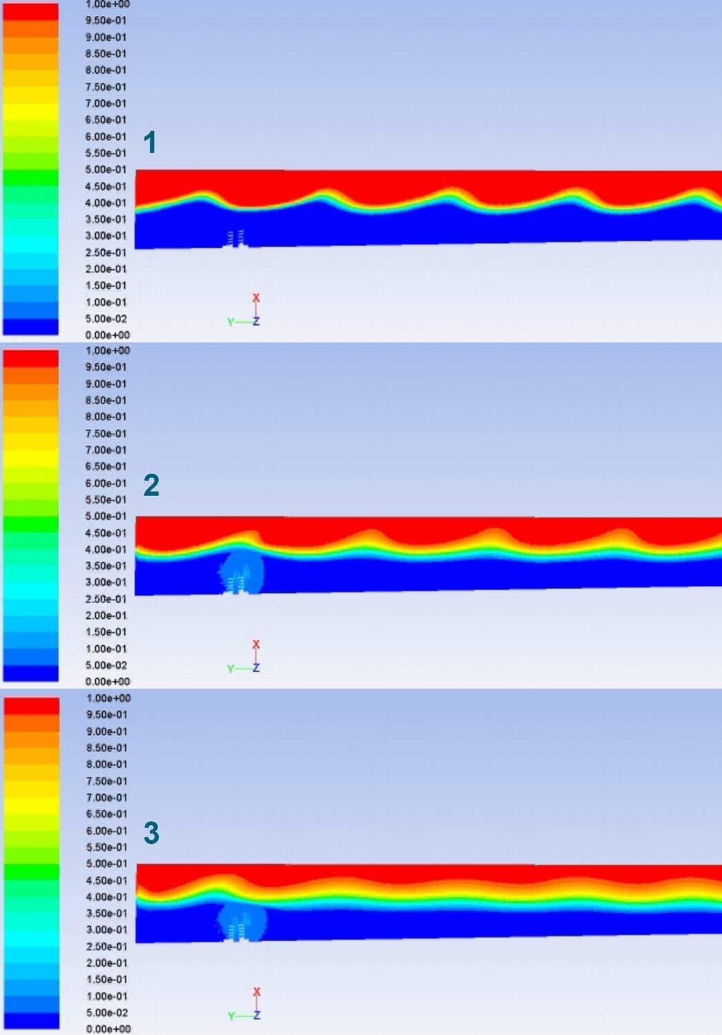 La simulazione con onde è stata eseguita con lo scopo di verificare se la struttura, in quanto sommersa, avesse potuto interferire in modo significativo con il moto ondoso.